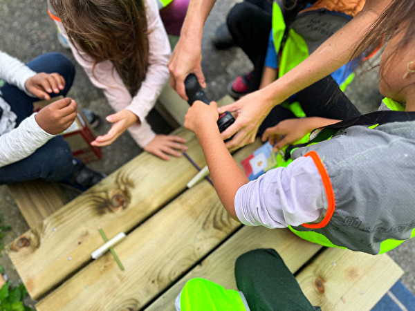L’ombre est assurée par des voiles tendues, offertes généreusement par le chantier naval Beck, que nous remercions pour ce geste durable et inspirant. Ces voiles ont été peintes par les classes de l’école de Faoug, apportant une touche artistique et colorée à cet espace commun.